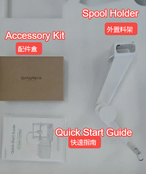 2. นำอุปกรณ์เสริมออก: นำแผ่นกระดาษแข็งด้านบนออก จากนั้นหยิบที่ยึดหลอดฟิลาเมนต์ (Spool Holder), คู่มือเริ่มต้นฉบับย่อ (Quick Start Guide) และกล่องอุปกรณ์เสริมออกมา