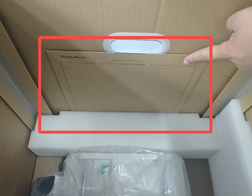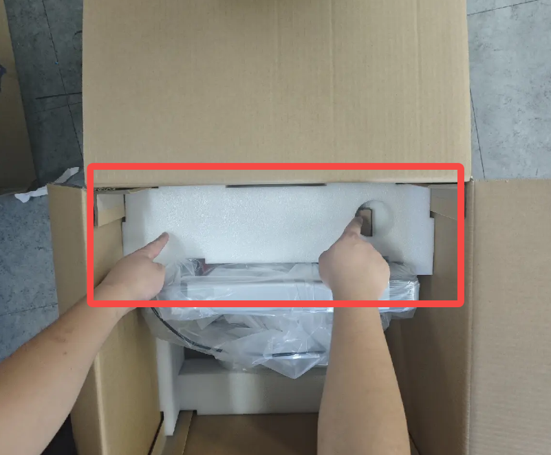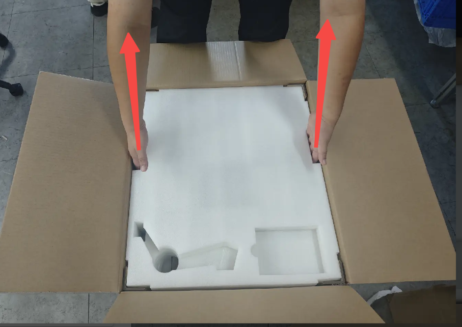 3. นำโฟมกันกระแทกชิ้นบนออก: จับที่จับของโฟมด้วยมือทั้งสองข้างแล้วยกขึ้นตรงๆ