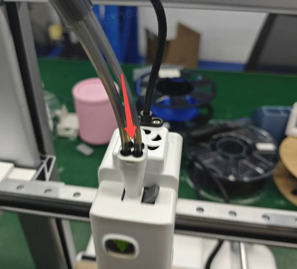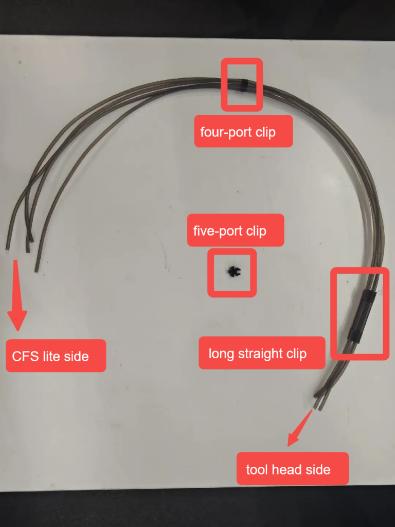 14. เสียบท่อ PTFE เข้ากับหัวพิมพ์: เสียบปลายอีกด้านของท่อฟิลาเมนต์ทั้ง 4 ท่อเข้าไปใน Toolhead Manifold