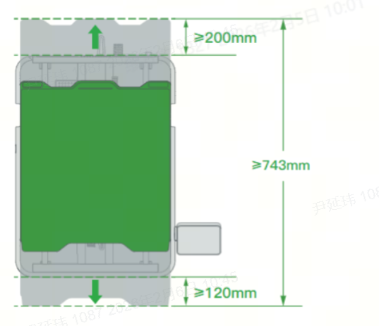 - เนื่องจากฐานพิมพ์มีการเคลื่อนที่ไปด้านหน้าและหลัง จึงต้องการระยะเคลื่อนที่รวมประมาณ 743 มม. (แนะนำให้เว้นระยะด้านหลัง 200 มม. และด้านหน้า 120 มม.)