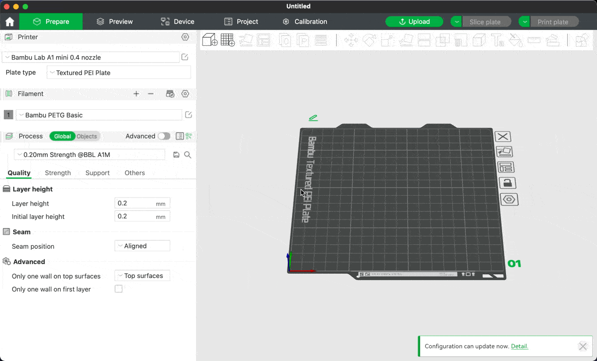 ในหน้าต่างนี้ จะมีขนาดรูหัวฉีดให้เลือกหลายขนาด ให้เลือกให้ตรงกับที่ใส่เข้าไปในเครื่อง ตัวหัวฉีดจะมีให้เลือกแบบธรรมดา ที่ทำจาก Stainless Steel และแบบ Hardened Steel ชุดแข็ง ที่ทำจากเหล็ก ควรเลือกให้ตรง เพราะวัสดุที่ทำหัวฉีด จะมีค่าการนำพาความร้อนต่างกัน ถ้าเลือกผิด อาจจะทำให้เส้นหลอมละลายไม่ดี และอาจทำให้หัวฉีดตันได้ สำหรับขนาดรูหัวฉีด จะมีให้เลือก 0.2 / 0.4 / 0.6 และ 0.8 มิลลิเมตร