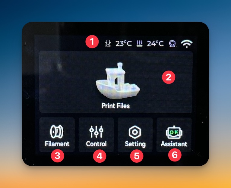 เครื่อง A1 Series มาพร้อมหน้าจอสี แบบ Touch Screen ซึ่ง รุ่น A1 กับ A1 mini จะแตกต่างกันเรื่องของขนาดหน้าจอ ตัว A1 หน้าจอจะใหญ่กว่า ส่วน Layout ของคำสั่งและการแสดงผล จะเหมือนกัน