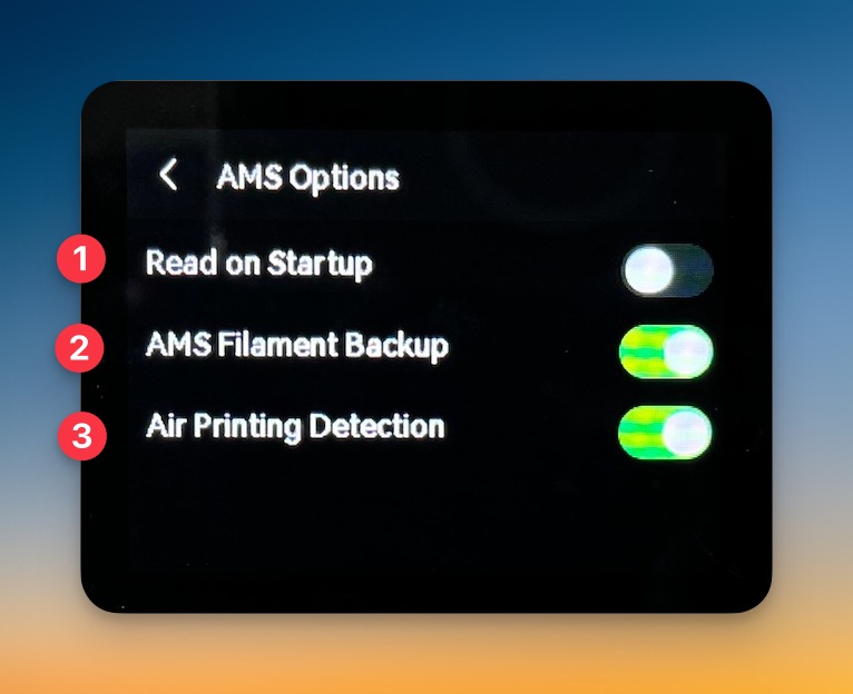 2. AMS Filament Backup สำหรับตั้งให้เครื่องใช้เส้นพลาสติกม้วนต่อไป ในกรณีที่ม้วนพลาสติกที่พิมพ์อยู่หมดระหว่างพิมพ์งาน ซึ่งการเปลี่ยน เครื่องจะเลือกเปลี่ยนเป็นเส้นชนิดเดียวกัน ถ้าเส้นที่ใส่อยู่ต่างชนิดกัน ฟังค์ชั่นนี้จะไม่ทำงาน เครื่องจะรู้ว่าเส้นที่ใส่อยู่ใน AMS lite เป็นชนิดใด ด้วยการที่ผู้ใช้เป็นคนป้อนค่า ตอนที่ใส่ Load เส้นใน แทบหน้าต่าง Filament
