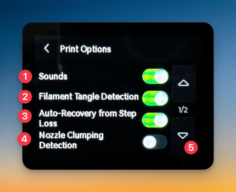1. Read on Startup สำหรับอ่านค่า NFC Tag เพื่อกำหนดชนิดของเส้นพลาสติกแบบอัตโนมัติ ฟีเจอร์นี้จะใช้ได้กับเส้นยี่ห้อ Bambulab เท่านั้น เพราะม้วนเส้นมี NFC Tag ฝังอยู่