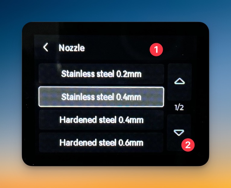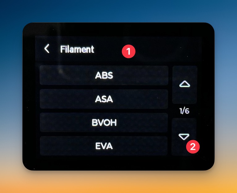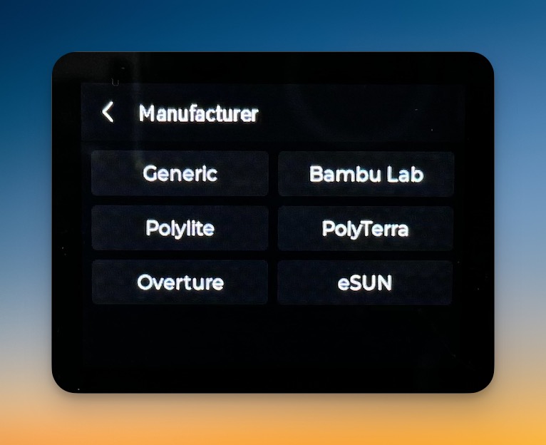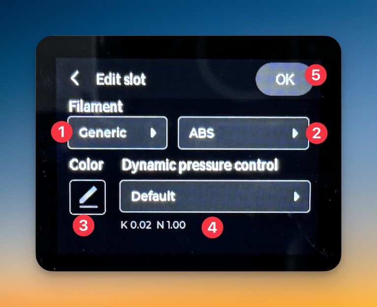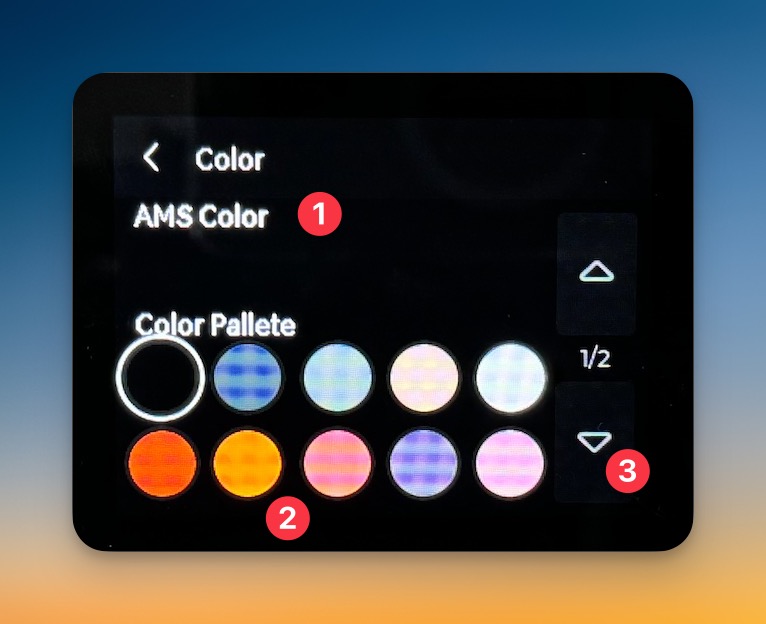 หลังจากเลือกยี่ห้อและชนิดของเส้นพลาสติกแล้ว ตัวเครื่องยังจะให้ระบุสีของเส้นที่ใส่เข้าไปด้วย ซึ่งข้อดีคือ เวลาเชื่อมเครื่องปริ้นเข้ากับ Computer ตัวโปรแกรม Slicer จะสามารถดึงข้อมูลของสีเส้น รวมไปถึงชนิดและยี่ห้อ เข้าไปที่โปรแกรม เวลาดูโมเดลในโปรแกรม Slicer ก็จะเห็นเป็นสีเดียวกันกับที่ใส่เข้าไปในเครื่อง นอกจากนั้น ถ้าใช้ AMS Lite ที่ปริ้นได้ 4 สี ก็จะช่วยทำให้การระบายสีโมเดลในโปรแกรม Slicer ทำได้สนุกขึ้น เห็นในโปรแกรม ว่าโมเดลที่ปริ้นออกมาแล้ว จะเป็นแบบไหน