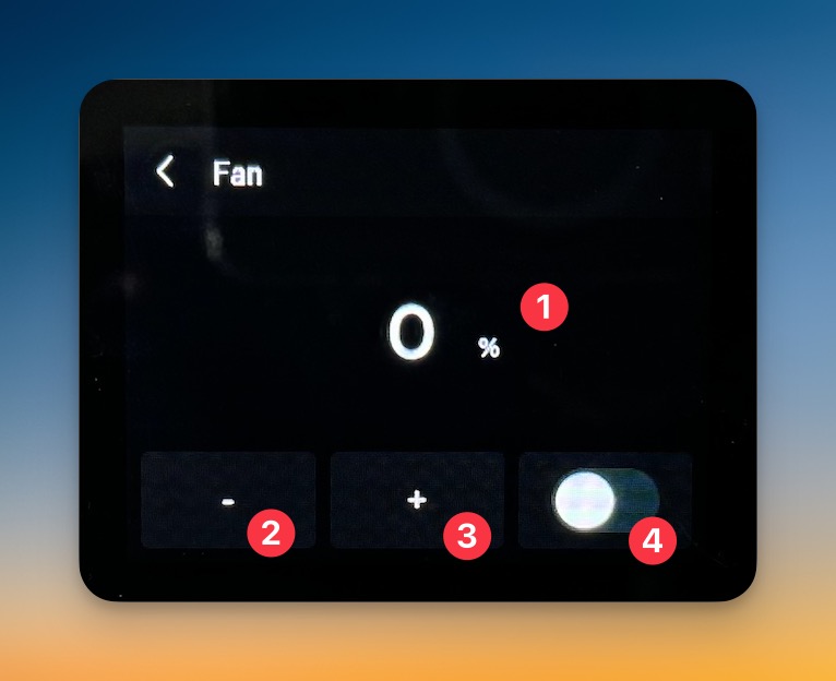 พัดลมเป่างานจะทำงานแบบอัตโนมัติและแปรผันไปตามทางเดินของหัวพิมพ์ ซึ่งจะถูกกำหนดมาจากโปรแกรม Slicer ถ้าผู้ใช้ต้องการเพิ่มหรือลด ก็สามารถที่จะทำได้ผ่านคำสั่ง Fan ซึ่งจะมีหน่วยเป็น %