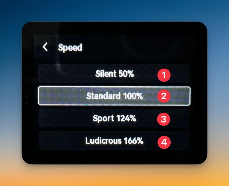 เครื่อง Bambulab จะมีค่าความเร็วมาให้เลือกด้วยกัน 4 ระดับ มีหน่วยเป็น % มาตราฐานความเร็วที่มาจากโปรแกรม จะมีค่าเท่ากับ 100%