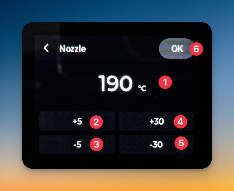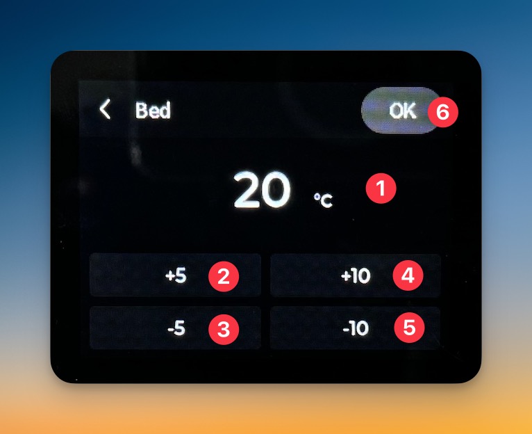 เวลาปริ้นงาน ค่าความร้อนของฐานปริ้น จะถูกกำหนดมาแล้วตั้งแต่ในโปรแกรม Slicer ผู้ใช้อาจไม่จำเป็นต้องมาปรับในส่วนนี้ การปรับเพิ่มและลดความร้อนฐานปริ้น อาจจะทำให้งานปริ้นหด และหลุดออกจากฐานได้ ดังนั้น ผู้ใช้ควรมีความเข้าใจ ก่อนที่จะทำการปรับความร้อนของฐานพิมพ์