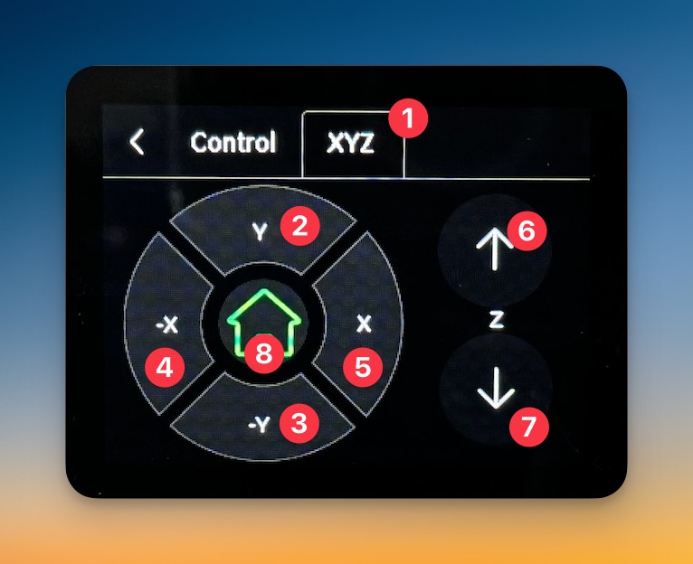 หน้าต่างนี้จะเกี่ยวกับการเคลื่อนที่หัวฉีด รวมไปถึงการเปิด-ปิดความร้อน การเปิด-ปิดไฟ เมื่อกดเข้ามาในหน้าต่างนี้ จะมีแทบให้เลือก 2 แทบด้วยกัน ได้แก่ แทบ Control กับ แทบ XYZ