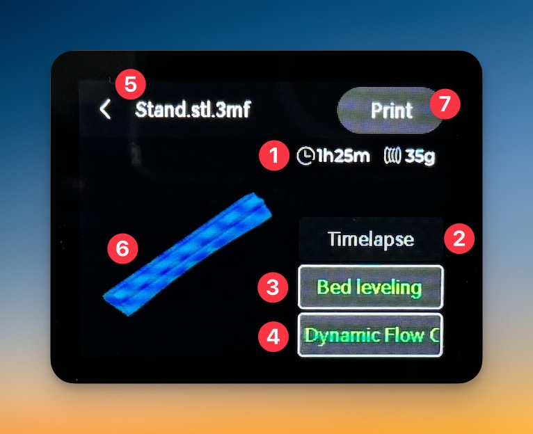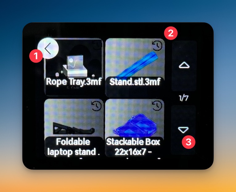 ในหน้าต่างนี้ จะรวมไฟล์สำหรับใช้ปริ้นกับเครื่อง ซึ่งไฟล์ จะถูกส่งมาเก็บอยู่ใน SD card ที่เสียบอยู่ด้านข้างเครื่อง ซึ่งการส่งไฟล์เข้ามาที่เครื่อง จะส่งผ่านโปรแกรม Bambu Studio ตัวไฟล์งาน จะมีรูปภาพแสดง รวมไปถึงชื่อไฟล์ เมื่อต้องการปริ้นไฟล์ไหน ก็ให้กดไปที่ไฟล์นั้น ตัวเครื่องก็จะแสง ภาพขนาดใหญ่ของชิ้นงานทีจะปริ้น รวมไปถึง บอกเวลาที่ใช้ปริ้น และน้ำหนักของเส้นพลาสติกที่จะใข้