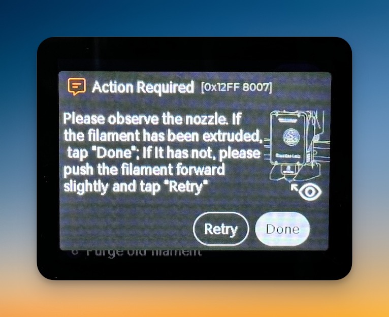 สำหรับหน้าต่างนี้ จะแสดงขึ้นมา เพื่อให้ผูัใช้สังเกตุว่าเส้นพลาสติกออกมาที่ปลายหัวฉีดหรือยัง ซึ่งถ้าเส้นยังไม่ออก ให้กด Retry แล้ว เอามือช่วยดันเส้นเข้าไป แต่ถ้าเส้นออกมาแล้ว ให้กด Done ได้เลย