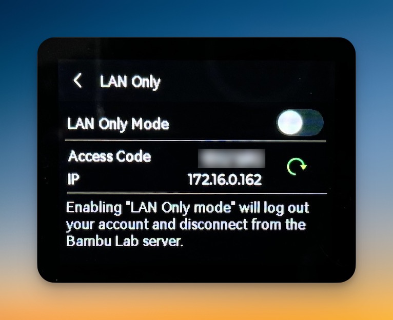 ในหน้าต่างนี้จะเป็นการตัดการเชื่อมต่อจาก บัญชี ที่ผูกไว้กับเครื่อง และตัดการเชื่อมต่อเครื่องจาก Internet ให้ไปใช้ระบบ Network ภายในแทน ซึ่งเหมาะสำหรับบริษัท ที่ไม่ต้องการส่งไฟล์ผ่าน Cloud เพราะกลัวเรื่องความลับ เวลาส่งไฟล์ ก็ให้กรอกตัวเลข Access Code ลงไป ในโปรแกรม Bambu Studio เลือกแทบหน้าต่าง Device เพิ่มเครื่องโดยกด Bind with pin code แล้วใส่รหัส Access Code ที่เป็นตัวเลข 6 หลัก ที่เครื่องให้มา