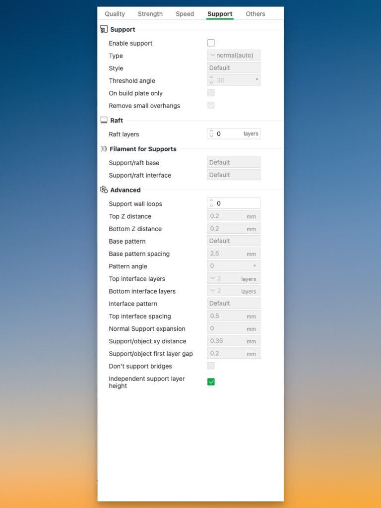 โมเดล 3 มิติ ที่มีส่วนยื่น หรือส่วนเกินที่ลอยยื่นออกมาจากตัวโมเดล ทีเรียกกันว่า Overhang จำเป็นต้องมีการสร้าง Support หรือตัวรองรับมาค้ำในส่วนที่ลอย เพื่อให้เครื่องสามารถปริ้นงานได้ ซึ่งในแทบนี้ จะเป็นการตั้งค่าเกี่ยวกับการสร้างตัวรองรับ ทั้งในเรื่องของรูปแบบ และระยะห่างของตัว Support และตัวงาน ซึ่ง Support จะแกะง่ายหรือยาก ก็ต้องมาปรับในแทบนี้
