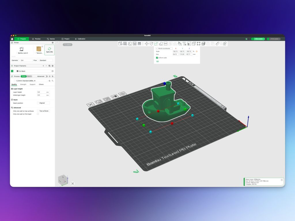 ข้อสำคัญก่อน Slice ไฟล์ คือให้เช็ครุ่นเครื่อง / ชนิดแผ่นฐาน และเส้นพลาสติกที่ใช้ให้ตรงกับที่ใส่ในเครื่อง ถ้าเลือกผิดเครื่องอาจไม่ทำงาน หรืออาจทำให้หัวฉีดตันได้