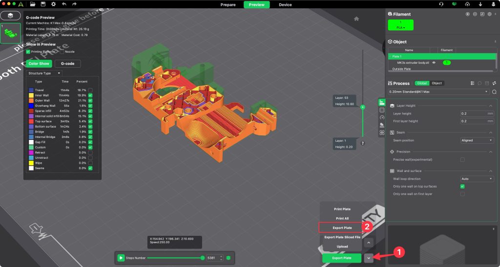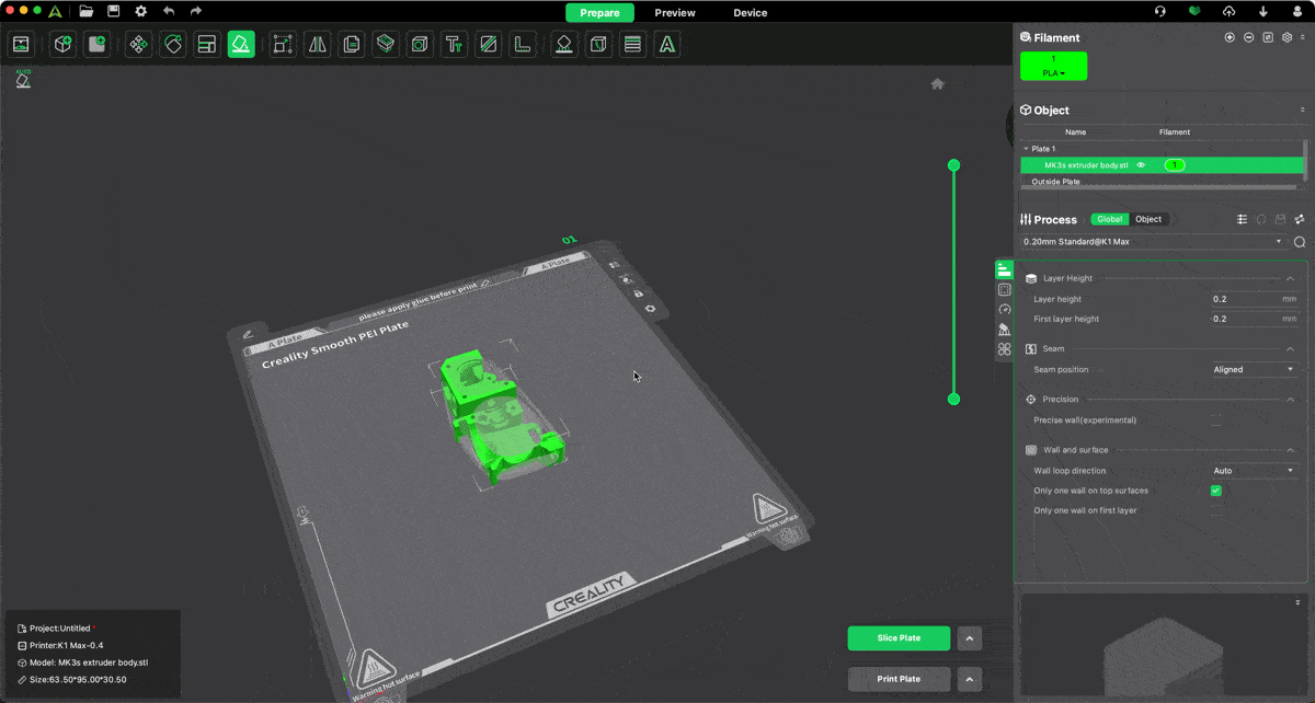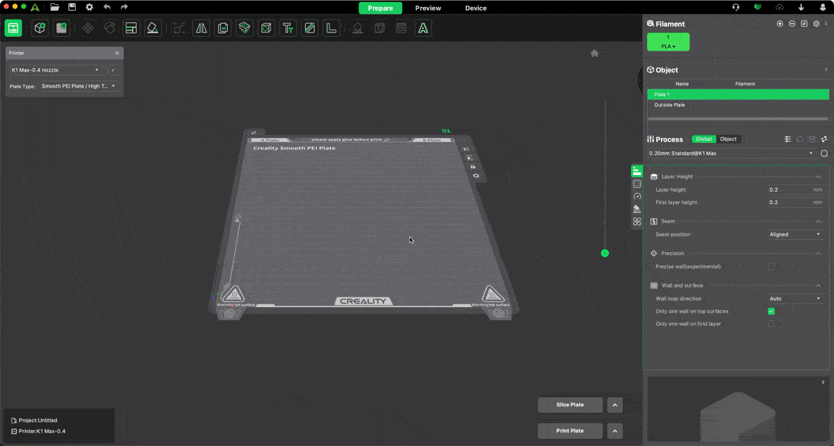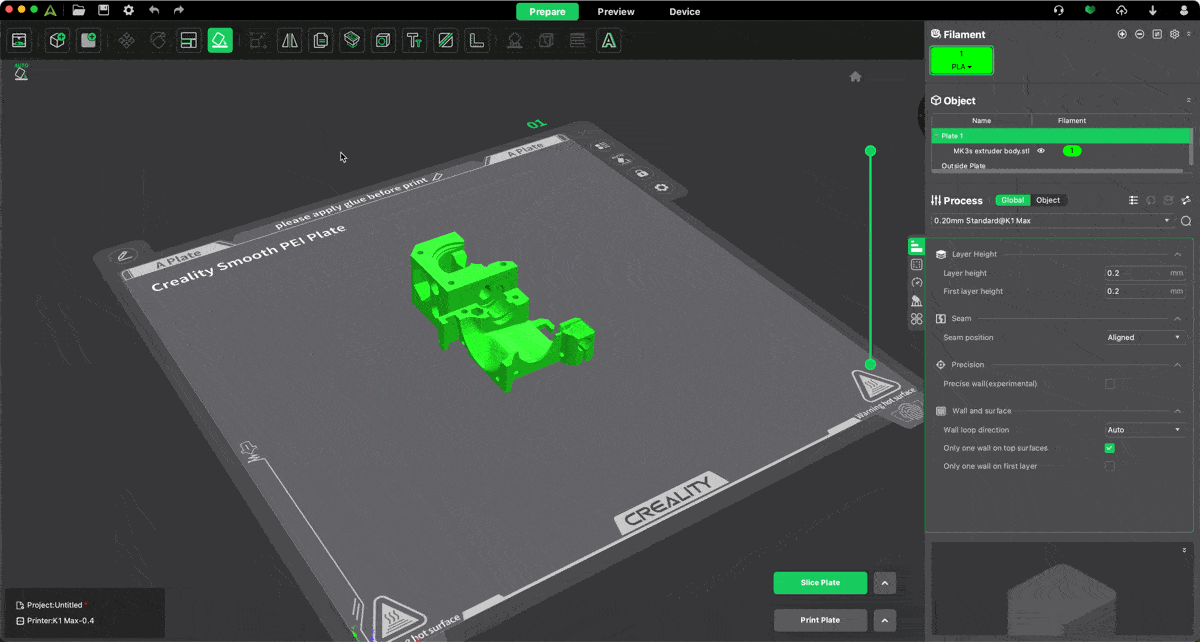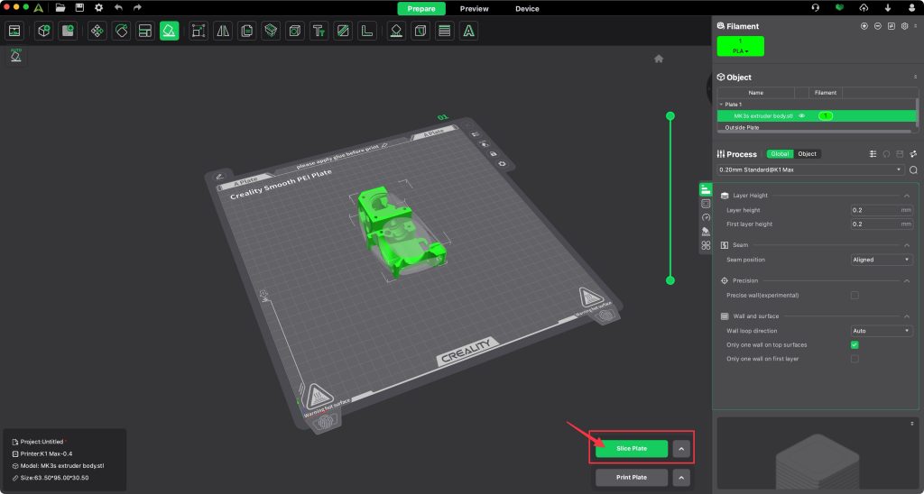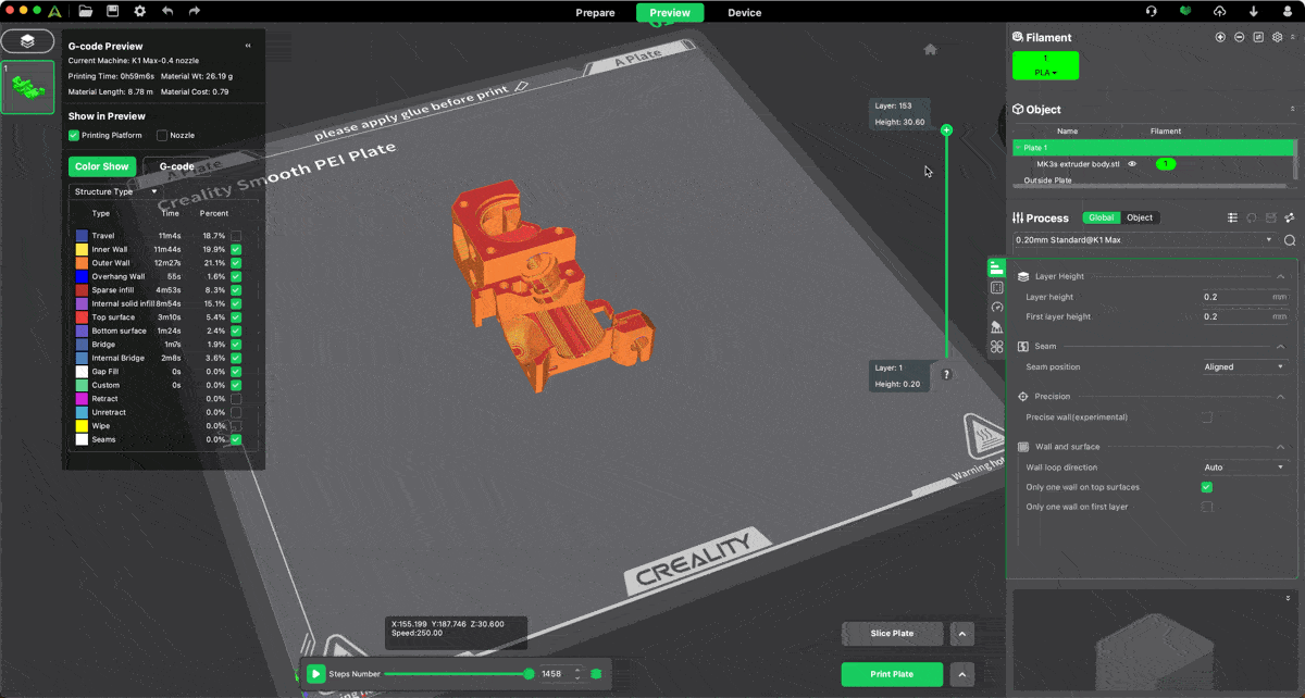 เมื่อตั้งค่าทุกอย่างแล้ว ขั้นตอนต่อไปจะเป็นการสั่งให้โปรแกรมทำการ Slice และสร้างไฟล์ เพื่อนำไปปริ้นกับเครื่อง หลังจากที่สร้างไฟล์เสร็จ ตัวโปรแกรมจะเปลี่ยนไปที่แทบหน้าต่าง Preview เพื่อแสดงแบบจำลองทางเดินหัวพิมพ์ เพื่อให้ผู้ใช้ทำการเช็คทางเดิน ก่อนที่จะสั่งปริ้น