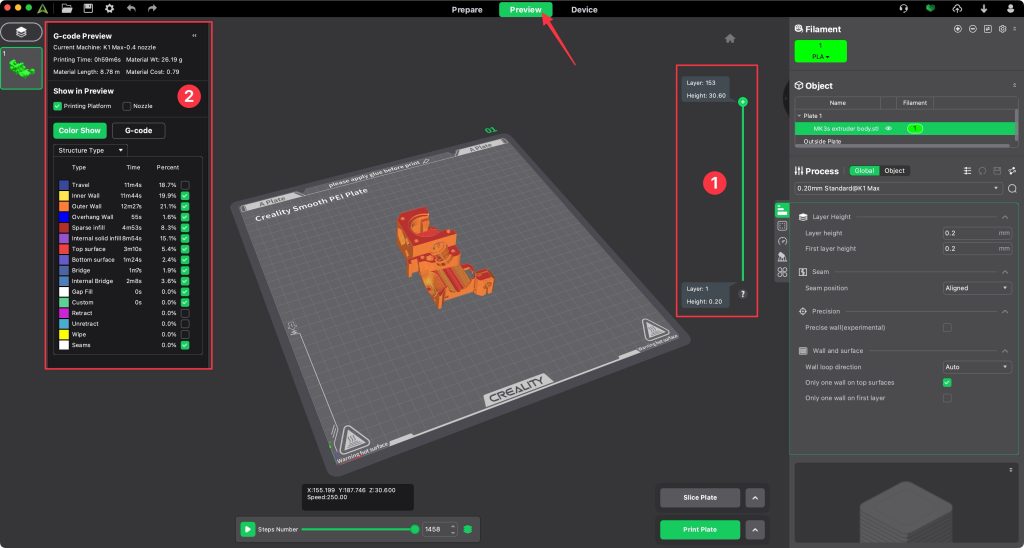 ตัวโปรแกรมจะสร้างทางเดินหัวพิมพ์ และแสดงขึ้นมาในหน้าต่าง Preview ซึ่งในหน้าต่างนี้ จะมีแทบสไลด์ ที่สามารถเลื่อนขึ้นและลง เพื่อดูการปริ้นงานในแต่ละชั้น รวมไปถึงแทบแสดงหน้าต่างแยกส่วนประกอบของทางเดินหัวพิมพ์ สำหรับเช็คในแต่ละส่วนได้
