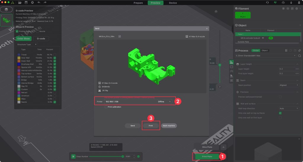 ก่อนที่จะกดปุ่ม Print แนะนำให้เลือกคำสั่ง Print Calibration ที่อยู่ด้านใต้เลข IP Address ด้วย เพื่อให้เครื่องทำการวัดระดับฐาน ก่อนที่จะปริ้นงาน และเวลาที่กดปุ่ม Print ต้องแน่ใจว่าไม่มีงานค้างอยู่ เพราะถ้ามี ตัวงานที่คัางอยู่ จะไปชนกับหัวฉีด ทำให้เครื่องเสียหายได้