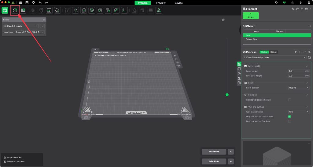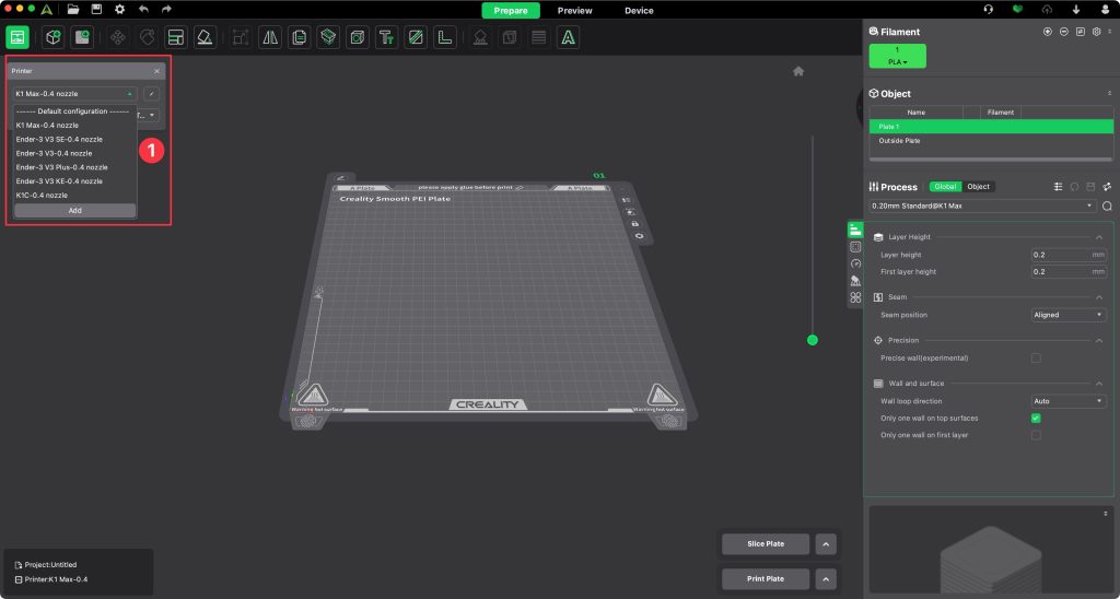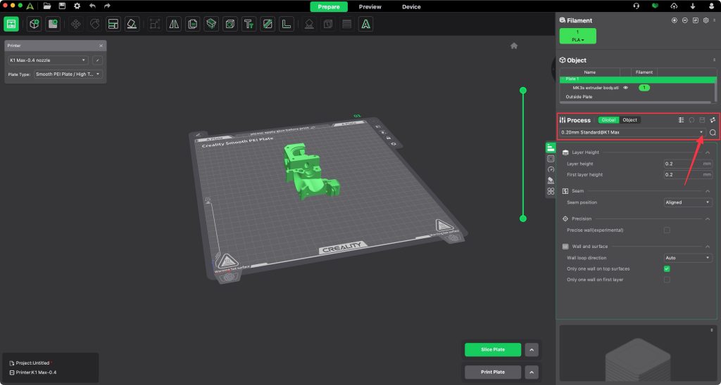 เมื่อจัดท่าทางการปริ้นได้แล้ว ให้เลือก Profile หรือค่าการพิมพ์ ที่อยู่ฝั่งด้านขวา ซึ่งจะเป็นค่าที่ทางโปรแกรม เตรียมไว้ให้ โดยปกติจะใช้ค่าความละเอียดในการปริ้นอยู่ที่ 0.20 ถ้าค่านี้ยิ่งน้อย งานปริ้นจะยิ่งละเอียด แต่ก็จะใช้เวลาปริ้นนาน กลับกัน ถ้าค่าตัวนี้ยิ่งมาก งานก็จะเห็นเป็นรอยชั้นๆ ต่อกัน แต่งานปริ้นก็จะเสร็จเร็วกว่า