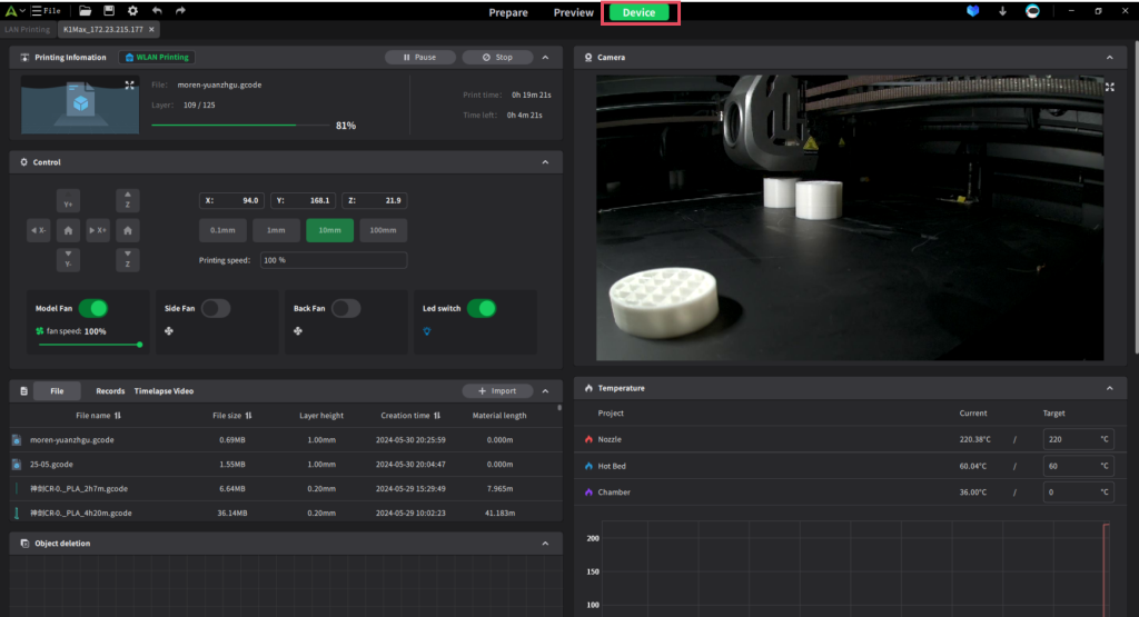 ตัวโปรแกรมจะมีแทบ Device ที่สามารถจะ Remote เข้าไปที่เครื่องปริ้น เพื่อที่จะควบคุมเครื่อง และดูการทำงานผ่านกล้องที่ติดอยู่ในเครื่อง นอกจากจะดูกล้องได้แล้ว ยังสามารถที่จะปรับความเร็ว หรือความร้อนของหัวฉีดและฐานพิมพ์ได้ รวมไปถึงการดึงไฟล์วิดีโอ ที่บันทึกไว้ ออกจากเครื่อง