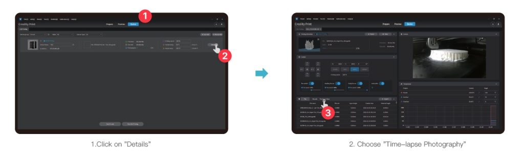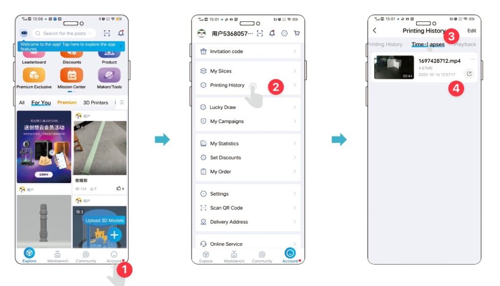 ในกรณีที่ไม่ได้อยู่ที่หน้าเครื่อง และอยากได้ไฟล์วิดีโอ ก็สามารถทำได้ผ่าน App Creality Cloud ซึ่งตัวเครื่องจำเป็นต้องต่อ Internet อยู่ ถึงจะทำได้