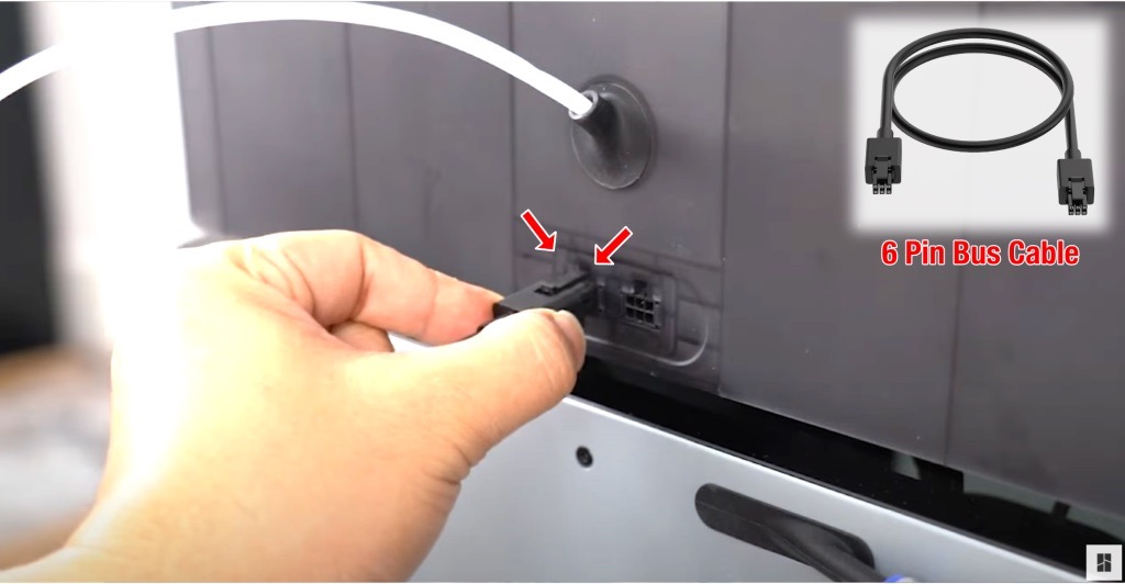 ส่วนสายไฟอีกเส้นที่เป็น 6 ช่อง จะเสียบ ตรงด้านหลังของเครื่อง AMS กับ ตัว Buffer ซึ่งตรง AMS จะมีรูให้เสียบ 2 ช่อง แนะนำให้ใช้ช่องซ้ายสุด