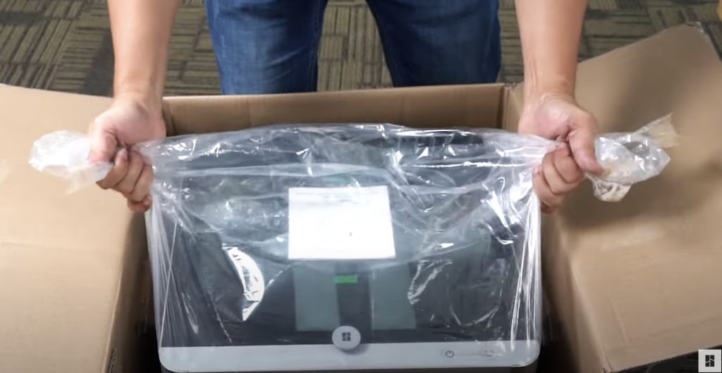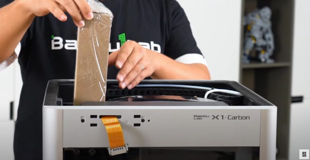 ตัวเครื่องจะอยู่ในถุงพลาสติก ขนาดใหญ่ สามารถที่จะดึงถุงพลาสติก ยกออกมาพร้อมกับเครื่องได้เลย ไม่ต้องกลัวถุงจะขาก ตัวเครื่อง X1C Combo มีน้ำหนักประมาณ 20 กิโลกรัม