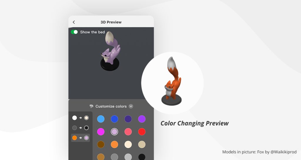 บางครั้ง การเดาสี ว่าโมเดลที่ปริ้นออกมาจะสวยหรือไม่สวย อาจจะนึกไม่ออก จนกว่าจะปริ้นเสร็จ ซึ่งบางที สีที่เลือก อาจจะไม่สวย ทำให้เสียเวลา และเสียพลาสติกในการปริ้น ตัว App Bambu Handy เลยมีฟีเจอร์ Preview ที่จะช่วยให้ผู้ใช้ สามารถกำหนดสี ในแต่ละส่วน แล้ว Preveiw หน้าตาของงานทีจะปริ้นเสร็จ ออกมาให้ดู ก่อนที่จะส่งไปปริ้นกับเครื่อง