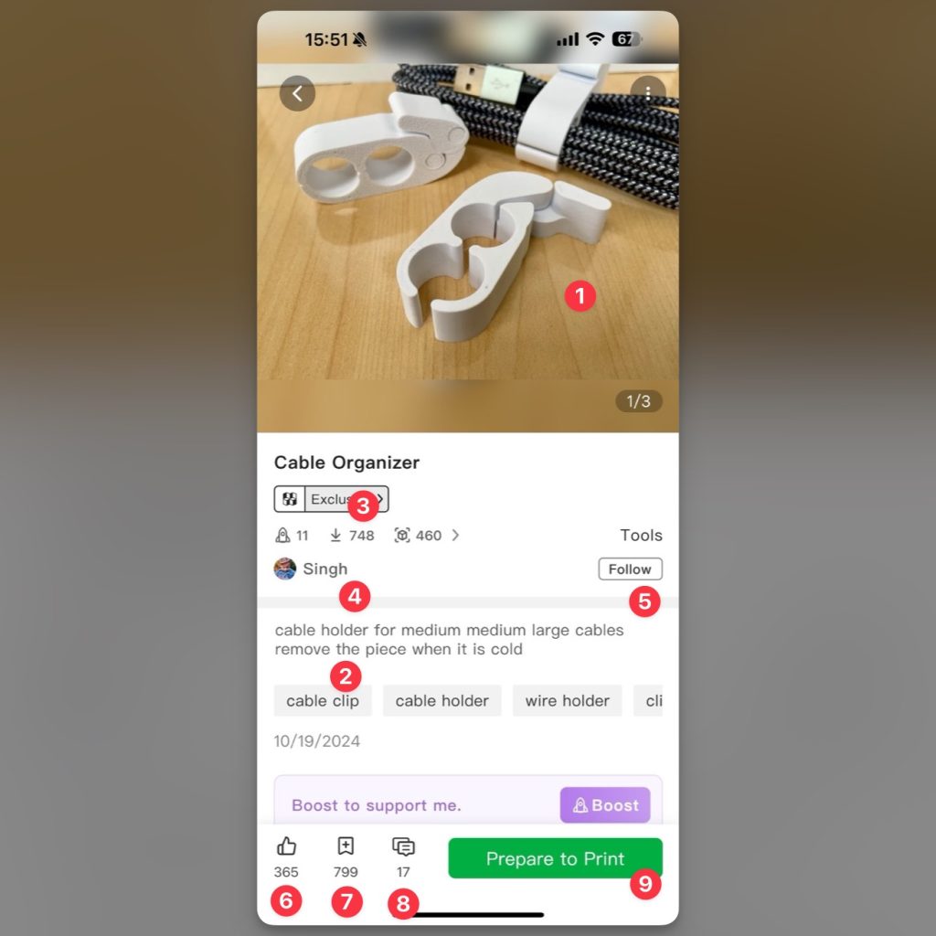 - ปุ่ม Comment ดูการพูดคุย เกี่ยวกับโมเดล ว่ามีคนที่ปริ้นไปแล้ว มีความคิดเห็นอย่างไรกับโมเดล รวมไปถึงอาจจะมีข้อแนะนำสำหรับคนที่กำลังจะเอาไฟล์โมเดลนี้ไปริ้น