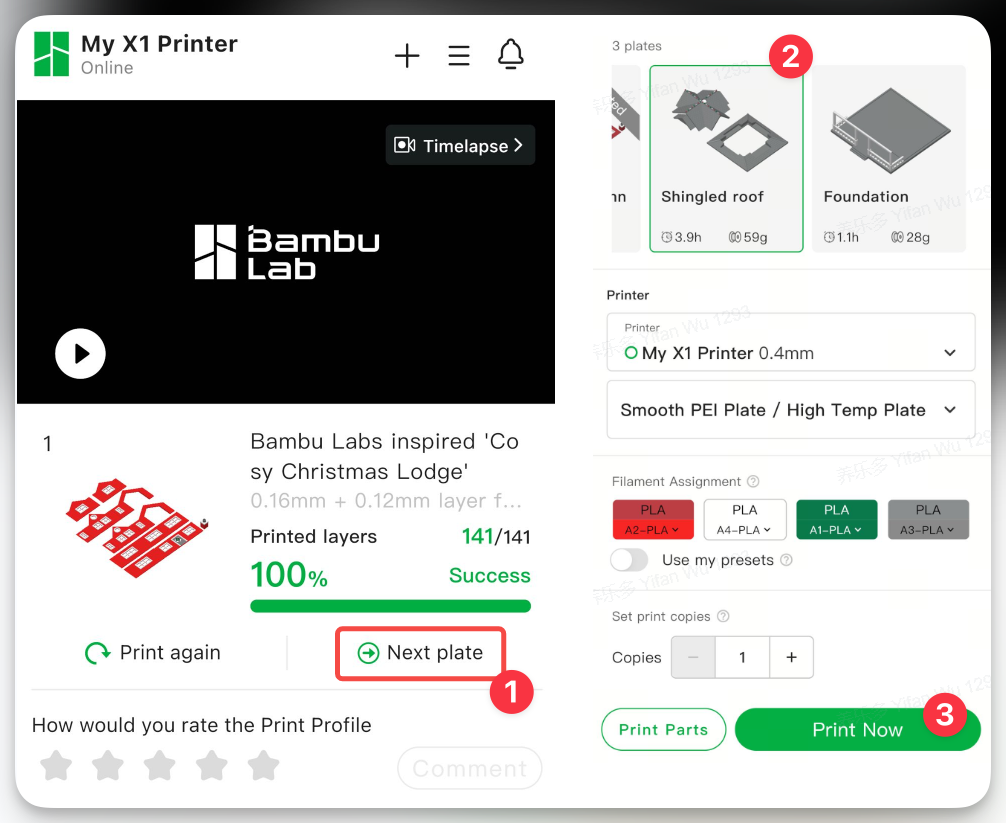 โมเดล 3 มิติบางไฟล์ อาจจะมีการแยกโมเดลมาเป็นชิ้นๆ และมีจำนวนเยอะ ทำให้ไม่สามารถปริ้นที่เดียวได้ จะต้องปริ้นหลายๆที่ ซึ่งตัวไฟล์ที่แจกมา ก็จะมีการแบ่ง Plate หรือจำนวนแผ่นที่จะต้องใช้ปริ้นเป็นหลายๆแผ่น ผู้ใช้ก็แค่เลือกว่าจะปริ้น Plate ไหนก่อน ซึ่งขั้นตอนการเลือก ก็จะเป็นไปตามนี้