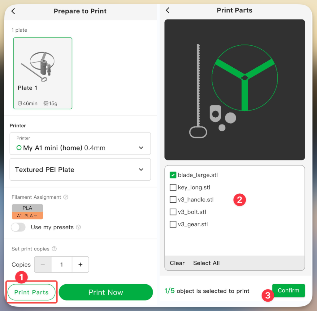 ไฟล์โมเดลบางไฟล์ อาจจะมีส่วนประกอบของโมเดลหลายชิ้น ซึ่งในบางครั้ง อาจจะต้องการเพียงบางชิ้น ไม่อยากปริ้นทั้งหมด ตัว App Bambu Handy ก็สามารถที่จะเลือกปริ้นเฉพาะโมเดลได้ โดยการกดปุ่ม Print Part แล้วเลือกไฟล์ที่ต้องการจะปริ้น การเลือกก็แค่ ติ๊กถูกหน้าชื่อไฟล์ที่ต้องการ ไฟล์ไหนไม่ต้องการปริ้น ก็ให้เอาเครื่องหมายติ๊กถูกออก เสร็ตแล้วกดปุ่ม Confirm