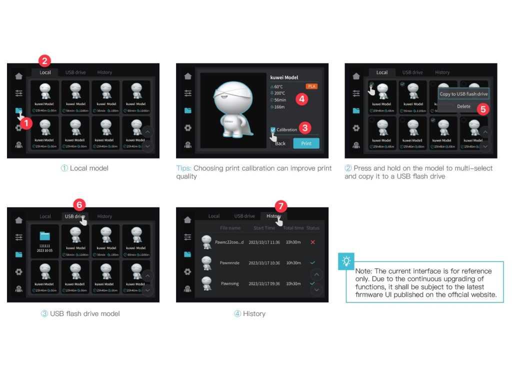 สำหรับตัวเครื่องจะมี หน่วยความจำภายใน ที่สามารถเก็บไฟล์สำหรับปริ้นได้ โดยไฟล์ที่ถูกส่งจากโปรแกรม Creality Print ผ่าน Wifi จะถูกเก็บเข้ามาอยู่ในเครื่อง ซึ่งหน่วยความจำภายใน จะอยู่ในแทบ Local นอกจากนั้น ด้านหน้าเครื่องยังมีช่องสำหรับเสียบ USB ซึ่งตัวเครื่องสามารถปริ้นผ่านไฟล์ผ่านช่องทางนี้ได้อีกด้วย การเลือกไฟล์ก็แค่กด ไปที่รูปงานที่ต้องการปริ้น