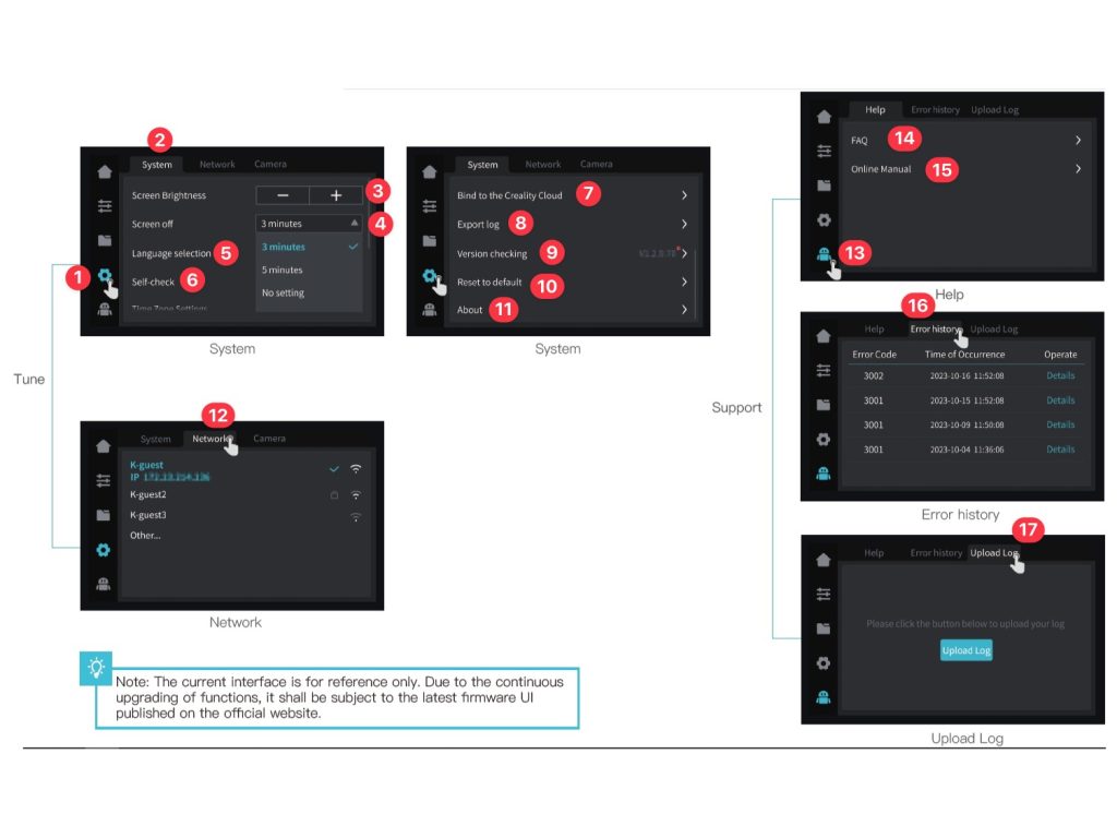 - Version Checking สำหรับตรวจสอบเวอร์ชั่น และ Update Firmware ของเครื่อง ในกรณีที่ต่อ Wifi และ Internet อยู่ ถ้ามี Firmware เวอร์ชั่นใหม่ออกมา ตัวเครื่องจะฟ้องที่หน้าจอให้ Update ซึ่งหลังจาก Update ควรจะทำการ Self Test และ Calibrate เครื่องใหม่ทั้งหมด
