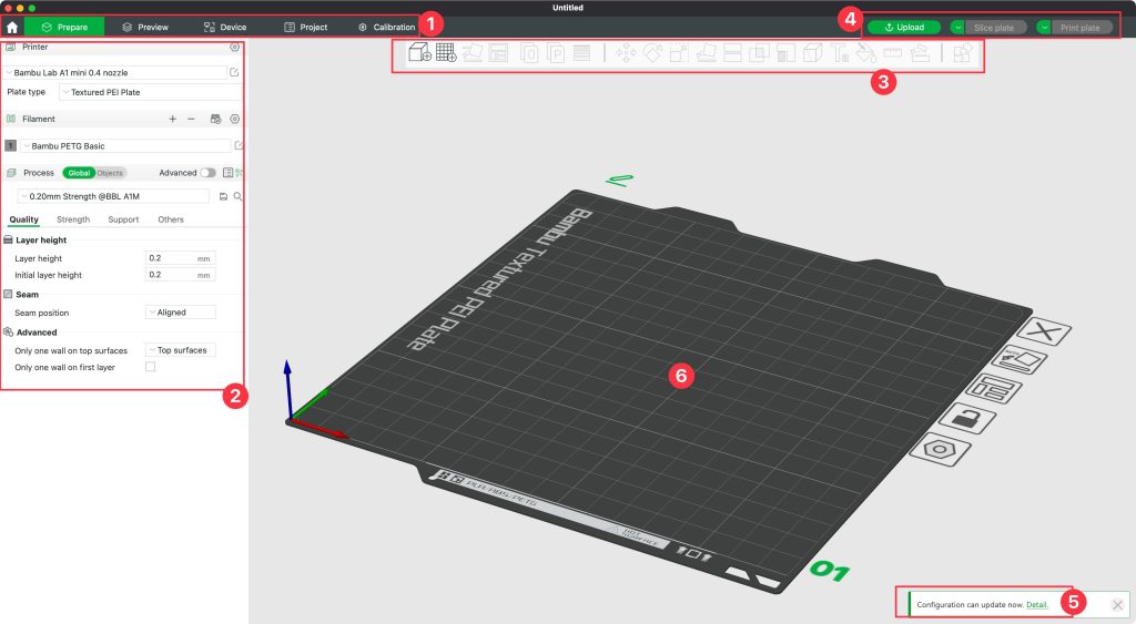 หน้าต่างนี้จะมีแทบด้านบน ที่จะแบ่งฟีเจอร์การใช้งานของโปรแกรม Bambu Studio ออกเป็น 6 แทบด้วยกันได้แท่