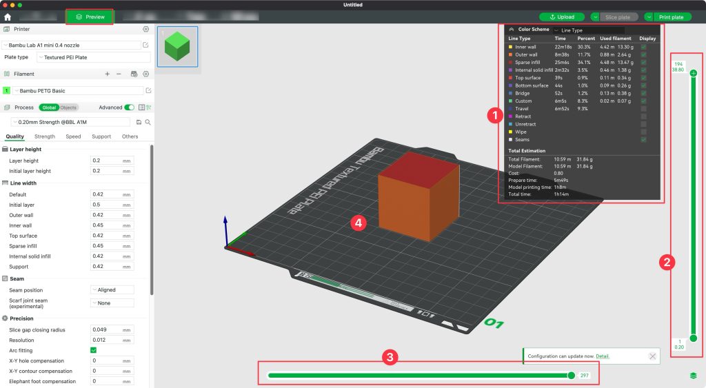 ในส่วนของแทบ Preview จะใช้ได้ก็ต่อเมื่อมีการกด Slice Plate เพื่อที่โปรแแกรมจะสร้าง ทางเดินของหัวพิมพ์ออกมา แล้วนำมาทำการจำลองหรือ Simulate ให้เห็นในแทบนี้ ในแทบนี้ จะมีตัวเลื่อนที่สามารถเลื่อนสไลด์เพื่อดูการว่า งานพิมพ์แต่ละชั้น พิมพ์แบบไหน