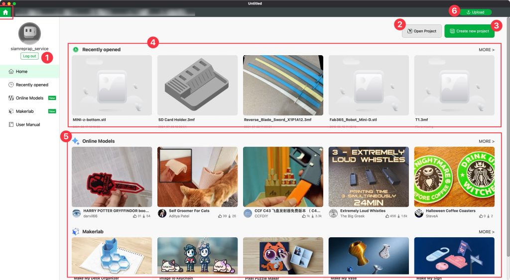 1. แทบ Home (รูปน้าน) จะเป็น Dashboard ที่รวมไฟล์งานล่าสุด ที่เคยทำ และไฟล์โมเดล 3 มิติจาก เว็บ Makerworld ที่สามารถเปิดและโหลดมาพิมพ์ได้เลยในโปรแกรม