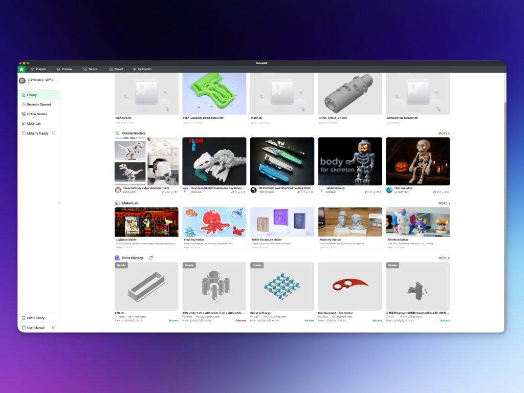1. แทบ Home (รูปน้าน) จะเป็น Dashboard ที่รวมไฟล์งานล่าสุด ที่เคยทำ และไฟล์โมเดล 3 มิติจาก เว็บ Makerworld ที่สามารถเปิดและโหลดมาพิมพ์ได้เลยในโปรแกรม