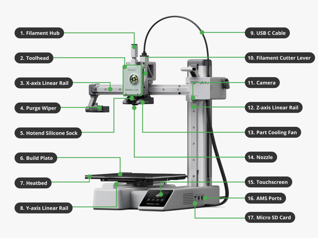เครื่อง A1 mini มาพร้อมกับหัวฉีดธรรมดา ที่ทำจากสแตนเลส มีขนาดรู 0.4 มิล ถ้าต้องการปริ้นเส้นพลาสติกที่ผสมคาร์บอนไฟเบอร์ หรือเส้นเรืองแสง สามารถที่จะเปลี่ยนเป็นหัวฉีดแบบชุบแข็ง Harden Steel ได้ หรือถ้าต้องการปริ้นงานที่มีรายละเอียดเยอะๆ ก็สามารถเปลี่ยนขนาดรูหัวฉีดให้เล็กลงได้ โดยหัวฉีดของเครื่อง A1 มีให้เลือกตั้งแต่ 0.2 / 0.4 / 0.6 และ 0.8 มิลลิเมตร