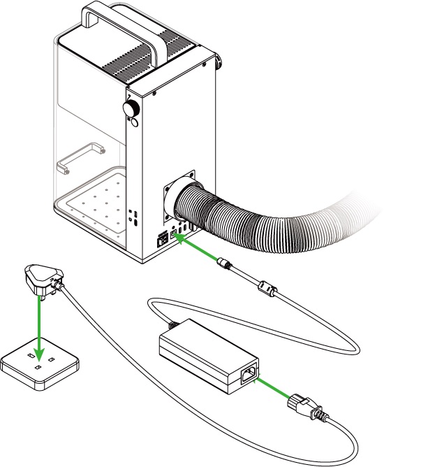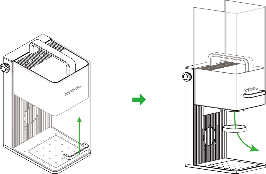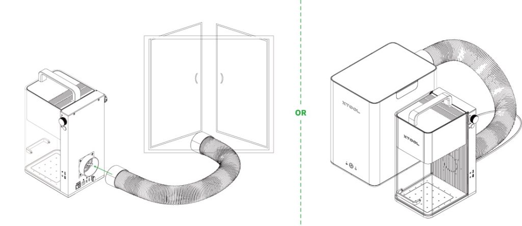 เชื่อมต่อปลายด้านหนึ่งของท่อเข้ากับช่องควันของ xTool F1 จากนั้นวางปลายอีกด้านของท่อออกไปนอกหน้าต่างหรือต่อเข้ากับตู้กรองกลิ่นและดูดควัน ถ้าไม่มีตัวดูดกลิ่น ก็ให้ต่อท่อทิ้งออกไปนอกหน้าต่าง