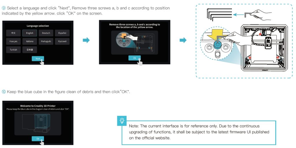 หลังจากขันน็อตยึดฐานพิมพ์ 3 ตัวออกแล้ว ตัวเครื่องจะแสดงหน้าต่าง เพื่อให้ผูัใช้อ่าน และกดยอมรับในการใช้เครื่อง และจะเข้าสู่โหมดการเชื่อมต่อ Wifi ซึ่งตรงนี้จะเหมือนกับการเชื่อมต่อ Wifi ทั่วๆไป โดยให้เลือกวง Wifi ที่ต้องการ แล้วใส่รหัส Wifi