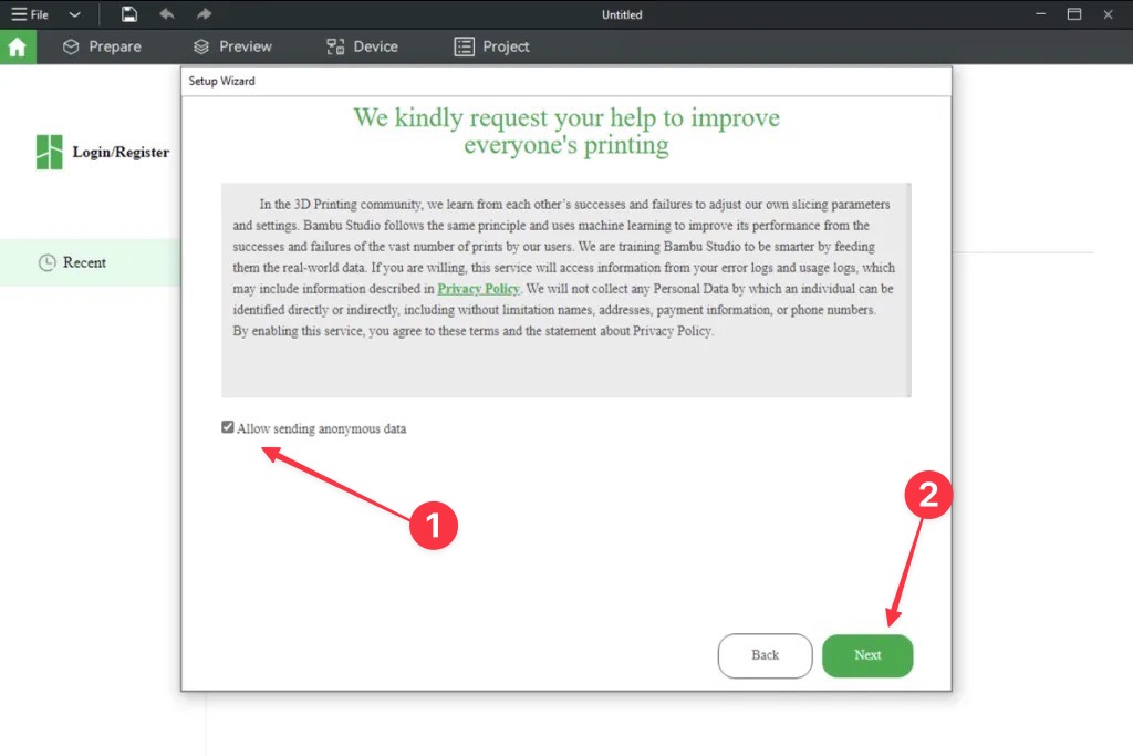 เลือก Consent เพื่อเป็นการส่งข้อมูลให้กับทาง Bambu Lab สำหรับการปรับปรุงการใช้งานโปรแกรม ในส่วนหน้าต่างนี้ จะติ๊กถูกในกล่องก็ได้ หรือไม่ติ๊กก็ได้ ถ้าไม่ต้องการให้เก็บข้อมูล เมื่อเลือกเสร็จแล้วให้กด Next