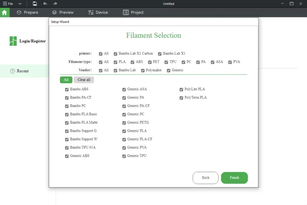 ทางร้านแนะนำให้เลือก เส้นเริ่มต้นดังต่อไปนี้ Bambu PLA / Polyterra PLA / Polylite PLA / Generic PLA / Generic ABS / Generic ASA / Generic PETG / Generic TPU ส่วนคนที่ซื้อเครื่อง Bambu Lab รุ่น X1 Combo ให้เลือก Bambu PLA-CF และ Bambu Support W เอาไว้ด้วย