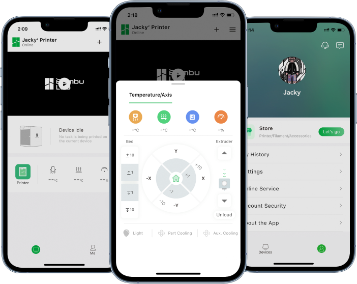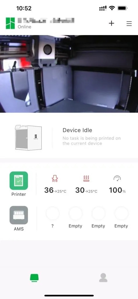 ถ้าการเชื่อมต่อ สมบูรณ์ ผู้ใช้สามารถกดปุ่ม รูป Play เพื่อที่จะให้กล้องที่ติดอยู่บนเครื่องทำงาน และแสดงภาพแบบ Real Time ได้ นอกจากนั้น ยังสามารถที่จะปรับเปลี่ยนความร้อนหัวฉีด รวมไปถึงความเร็วในการพิมพ์ผ่าน App ได้เลย นอกจากจะดูผ่าน App ได้แล้ว ยังสามารถที่จะดูผ่านโปรแกรม Bambu Studio ได้อีกด้วย