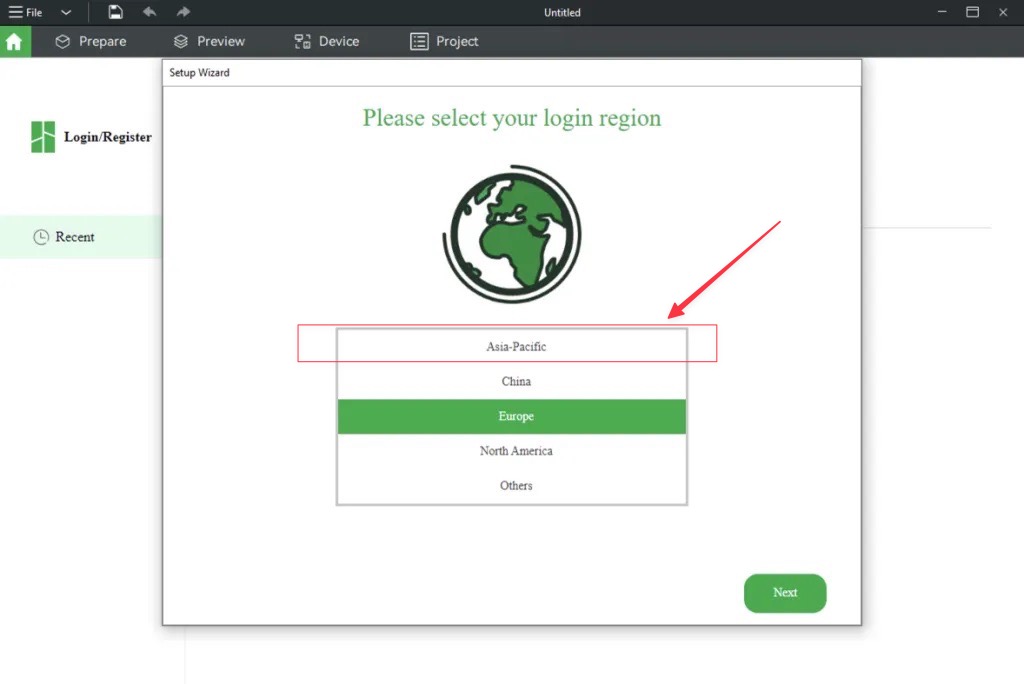 เลือกโซนทวีปที่อาศัยอยู่ ตรงนี้สำคัญเพราะจะเป็นการระบุให้โปรแกรมทำการเชื่อมต่อกับ Server ของทาง Bambu Lab ให้เลือกโซนที่ใกลักับประเทศที่อยู่มากที่สุด ทางประเทศไทยก็ให้เลือก Asia Pacific