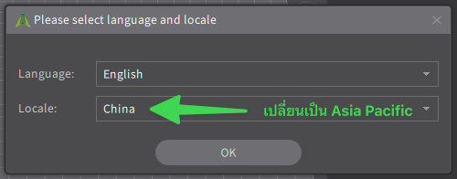 หลังจากติดตั้งโปรแกรม เมื่อเปิดโปรแกรมขึ้นมา ตัวโปรแกรมจะถามว่า ภาษาที่ต้องการติดตั้งและภูมิภาคหรือ ตำแหน่ง Server ที่ต้องการเชื่อมต่อ ตรงนี้ ให้เลือกภาษาเป็น English ส่วน Locale หรือ Region ให้เลือกเป็น Asia-Pacific