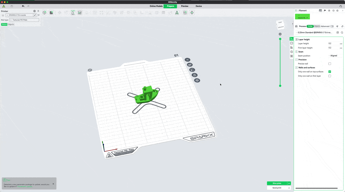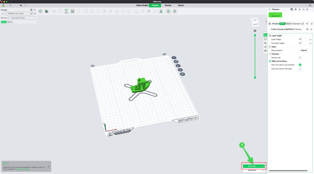 หลังจากเลือกเครื่อง / เส้นพลาสติก และ Process ที่จะใช้แล้วให้กดปุ่ม Slice Plate เพื่อให้โปรแกรม นำค่าที่เลือก มาคำนวนและสร้าง ไฟล์ทางเดินหัวพิมพ์ เพื่อทีจะส่งไปให้เครื่องพิมพ์ 3 มิติ ซึ่งการ Slice Plate จะเร็วหรือช้า ขึ้นอยูกับ เสปคของคอมพิวเตอร์ รวมไปถึงขนาดและความซับซ้อนของโมเดล 3 มิติ ที่นำมาปริ้น