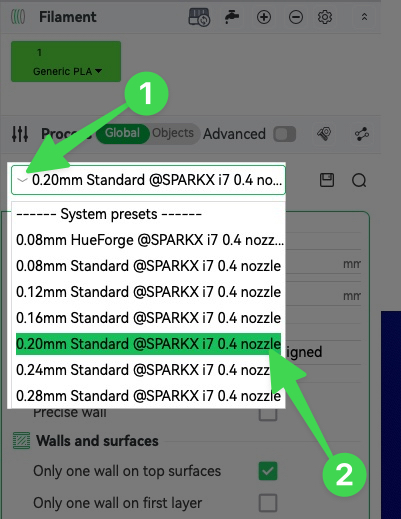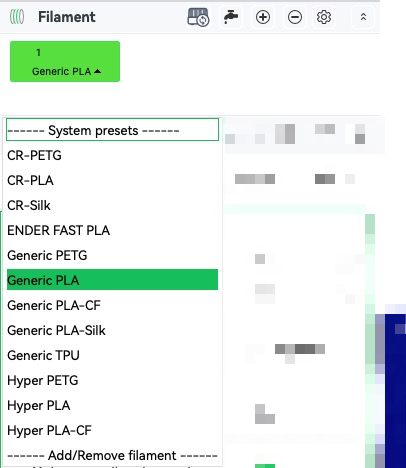 ในช่อง Filament อาจจะมีเส้นให้เลือกหลายชนิด ซึ่งหลักการในการเลือก ให้สังเกตุชื่อด้านหลังสุด ที่จะเป็นตัวบอกชนิดเส้นส่วนด้านหน้าจะเป็นตัวบอกยี่ห้อเส้น ยกตัวอย่าง
