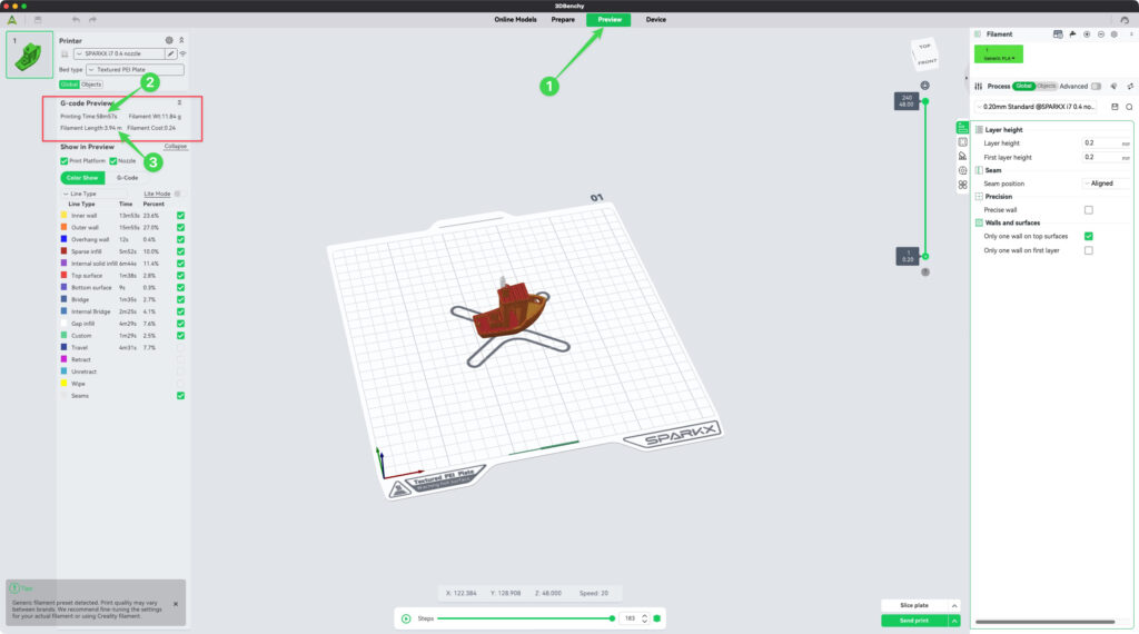 เมื่อโปรแกรมทำการคำนวนเสร็จแล้ว ตัวโปรแกรมการสลับหน้า จากหน้าต่าง Prepare ไปหน้าต่าง Preview เพื่อแสดงแบบจำลองทางเดินหัวพิมพ์ สำหรับให้ผู้ใช้ ทำการตรวจเช็ค ซึ่งหน้าต่างนี้ จะบอกทั้ง เวลาที่ใช้พิมพ์ รวมไปถึงปริมาณเส้นพลาสติกที่จะใช้