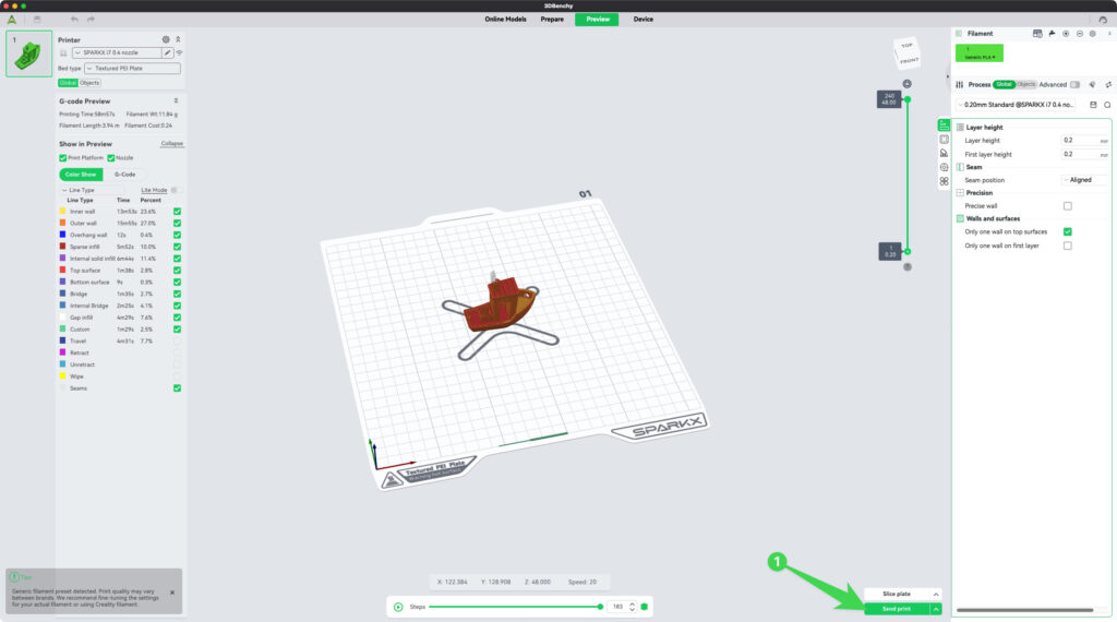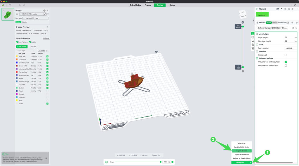 การส่งไฟล์ไปพิมพ์ (Send Print Jobs): หลังจากเช็คทางเดินหัวพิมพ์แล้ว ถ้าดูแล้วไม่มีอะไรผิดปกติ โมเดลที่เห็นมาครบ ไม่มีขาดช่วงหรือหายไปบางส่วน ก็สามารถส่งไฟล์ไปพิมพ์ที่เครื่องปริ้น 3 มิติ ได้เลย โดยการส่งไฟล์ไปปริ้น ผ่านโปรแกรม Creality Print จะมีด้วยกันหลายวิธี แต่สำหรับมือใหม่ ที่เชื่อมต่อเครื่องเข้ากับ Wifi หรือระบบ Network แล้ว ให้เลือก Send Print