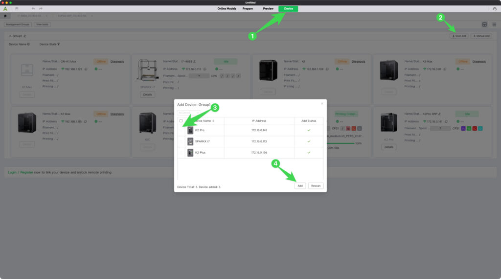 - ให้เลือกเครื่องที่ต้องการ Add โดยทำเครื่องหมายหน้าเครื่อง ในกรณี ที่ไม่เจอเครื่องให้กดปุ่ม Rescan ตรงข้างๆ ปุ่ม Add ถ้ากดแล้วยังไม่เจอ แปลว่า เครื่อง และโปรแกรม อาจจะเชื่อมต่อ Wifi คนละวง ให้ลองเปลี่ยนการเชื่อมต่อ Wifi ให้อยู่ในวงเดียวกัน และกดปุ่ม Rescan ใหม่