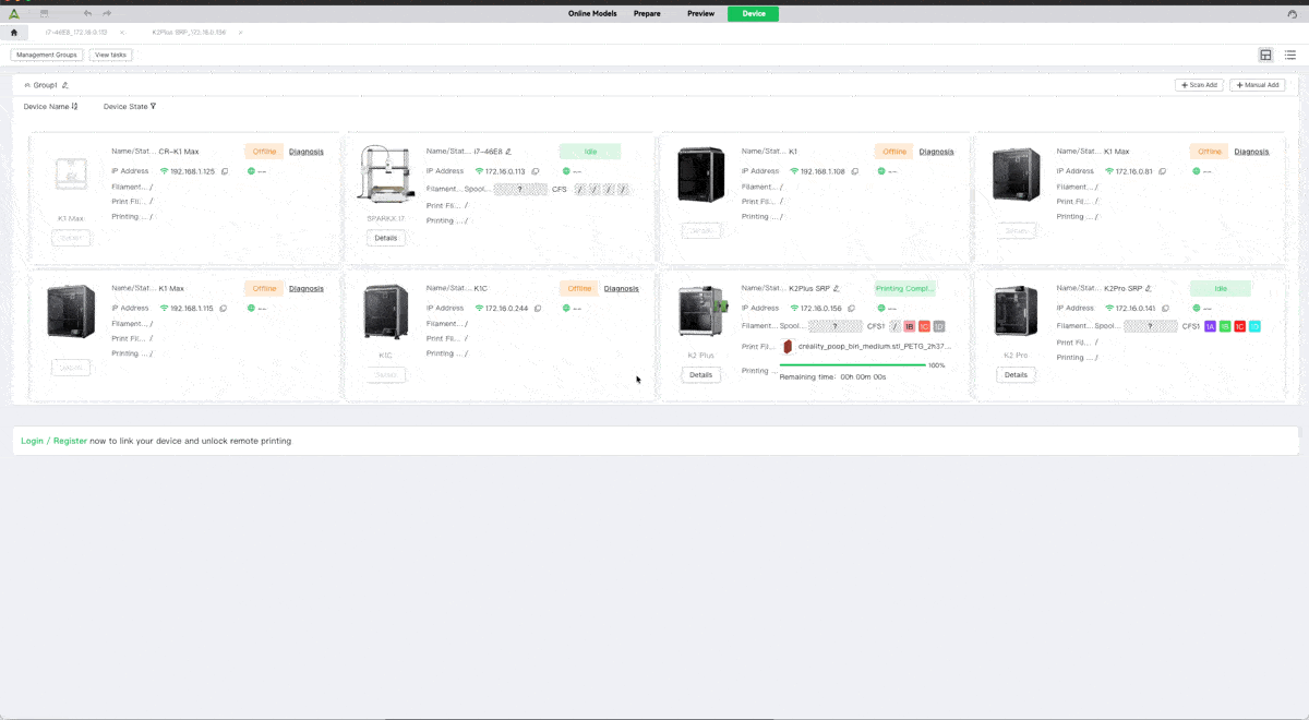 สำหรับเครื่อง Creality นั้น สามารถที่จะดูการทำงานของเครื่องผ่าน App มือถือ Creality Cloud หรือจะผ่านโปรแกรม Creality Print ก็ได้ สำหรับการปริ้นครั้งแรก ทางร้านจะสอนควบคุมและดูการทำงานของเครื่องผ่าน โปรแกรม Creality Print